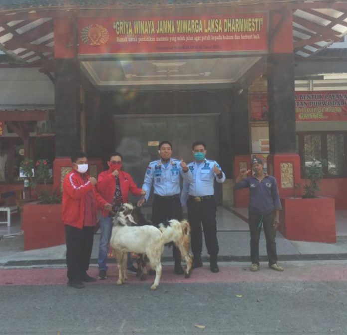 Kabupaten Grobogan – DPC PDI Perjuangan Grobogan menyerahkan hewan kurban berupa 2 ekor kambing ke Rutan (Rumah Tahanan) Kab.Grobogan, untuk selanjutnya dibagikan kepada warga binaan yang ada di dalamnya, Kamis (30/7/2020).