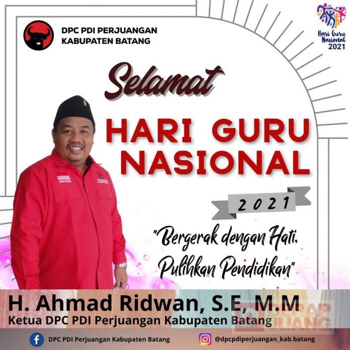 Kabupaten Batang – Ketua DPC PDI Perjuangan Batang, H. Ahmad Ridwan turut mengucapkan selamat Hari Guru Nasional. Hal ini Ia sampaikan sebagai bentuk apresiasi atas kinerja tenaga pendidik yang terus berkomitmen memajukan dunia pendidikan, Kamis (25/11/2021).