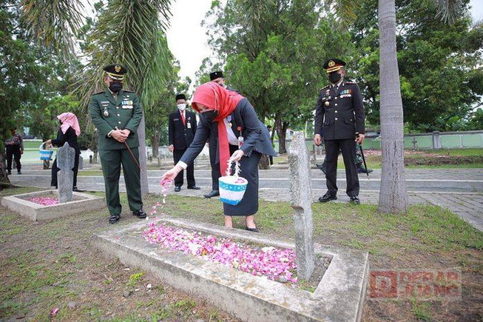 Kabupaten Klaten – Dalam rangka memperingati Hari Pahlawan 10 November 2021, Bupati Klaten, Hj. Sri Mulyani, S.M., bersama Forkopimda Klaten melaksanakan ziarah dan tabur bunga ke makam pahlawan nasional, di Taman Makam Pahlawan (TMP) Ratna Bantala Klaten, Rabu (10/11/2021).