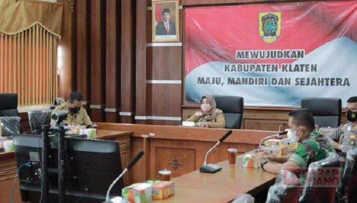 Kabupaten Klaten – Disiplin protokol kesehatan (Prokes) harus tetap dilakukan karena kondisi masih dalam Pandemi Covid-19. Tentunya harus dilakukan semua pihak maupun masyarakat khususnya di Kabupaten Klaten agar tidak ada lagi lonjakan kasus Covid-19. Hal tersebut disampaikan Bupati Klaten Hj. Sri Mulyani, S.M., di Kantor Pemerintah Kabupaten Klaten, Senin (03/01/2021).