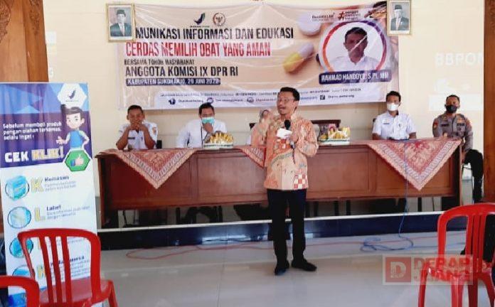Kabupaten Sukoharjo – Anggota Komisi IX DPR RI Fraksi PDI Perjuangan, Rahmad Handoyo melakukan sosialisasi terkait keamanan obat dan makanan di Pendopo Balai Desa Mertan, Kecamatan Sukoharjo, Rabu (29/06/2022)