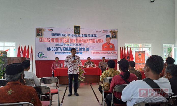 Kabupaten Boyolali – Anggota Fraksi PDI Perjuangan DPR RI, Rahmad Handoyo, S.Pi., M.M bersama Balai POM menggelar kegiatan sosialisasi dengan tema ‘Cerdas Memilih Obat dan Makanan yang Aman’. Giat tersebut diselenggarakan di Gedung Serba Guna Kantor Desa Mojolegi, Kecamatan Teras, Kamis (27/10/2022).