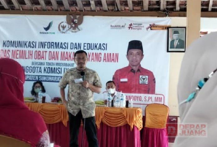 Kabupaten Sukoharjo – Guna menjalin silaturahmi sekaligus memberikan wawasan kepada masyarakat Weru, Sukoharjo, Anggota Komisi IX DPR RI dari Fraksi PDI Perjuangan, Rahmad Handoyo bersama Balai Besar Pengawas Obat dan Makanan (BBPOM) mengadakan kegiatan Komunikasi, Informas,i dan Edukasi di Pendopo Balai Desa Alasombo, Kecamatan Weru, Rabu (20/7/2022).