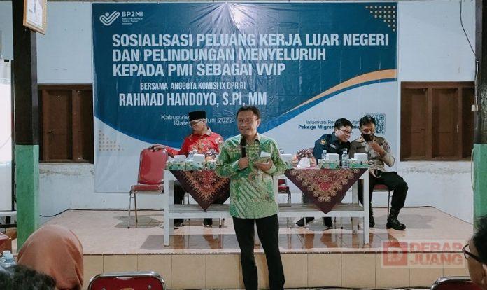 Kabupaten Klaten – Anggota Fraksi PDI Perjuangan DPR RI Rahmad Handoyo, S.Pi., M.M. menggelar sosialisasi terkait Peluang Kerja di Luar Negeri dan Perlindungan Menyeluruh Kepada PMI Sebagai VIP yang bertempat di Kantor Desa Socokangsi, Kecamatan Jatinom, Kamis (30/6/2022).