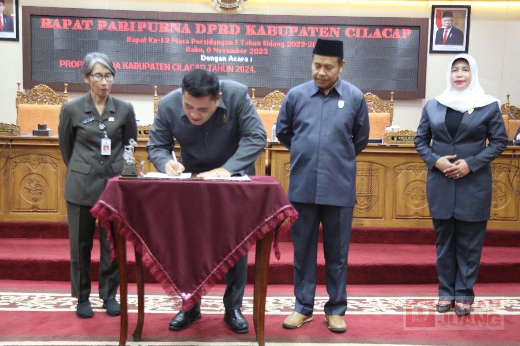 Kabupaten Cilacap – DPRD Kab. Cilacap menggelar Rapat Paripurna dengan agenda Penyampaian 2 Rancangan Peraturan Daerah (Raperda) dari Pj. Bupati Cilacap kepada DPRD Kabupaten Cilacap dan 2 Raperda dari DPRD Kabupaten Cilacap kepada Penjabat (Pj) Bupati Cilacap, Rabu (8/11/2023).