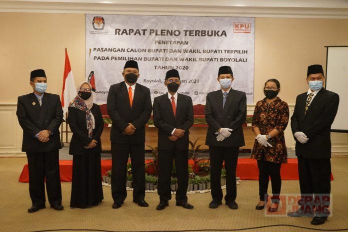 Kabupaten Boyolali – Bertempat di Hotel Al-Azhar Azhima, Jl. Embarkasi Haji No. 24, Desa Gagaksipat, Kec. Ngemplak, Kab. Boyolali, telah dilaksanakan kegiatan Rapat Pleno Terbuka Penetapan Pasangan Calon Bupati dan Wakil Bupati Terpilih pada Pemilihan Bupati dan Wakil Bupati Boyolali Tahun 2020, Kamis (21/1/2021).