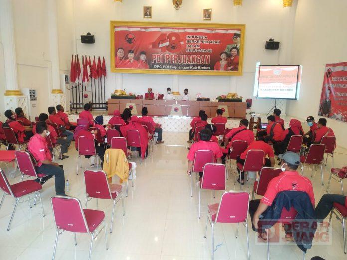 Kabupaten Brebes – DPC PDI Perjuangan Kab. Brebes secara resmi membuka Pendidikan Politik dalam Rangka memperkuat Ideologi Pancasila atau Ideologi Marhaen menuju 2024. Bertempat di Aula DPC PDI Perjuangan Kab. Brebes, kegiatan ini dihadiri oleh beberapa narasumber, di antaranya Wakil Ketua Bidang Pemenang Pemilu DPC PDI Perjuangan Kab. Brebes Karsono, S.Sos., Kepala Bidang Kesbangpol Kab. Brebes Muhammad Sidiq, S.Sst, M.Si, serta Kepala Bidang Politik Kesbangpol Kab. Brebes Drs. Kukuh Priyanto, M.Si, Rabu (3/2/2021).