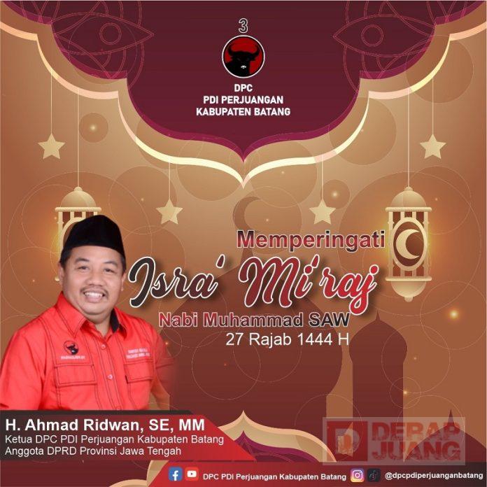 Tak lepas dari hal tersebut, Ketua DPC PDI Perjuangan Kabupaten Batang, H. Ahmad Ridwan mengatakan bahwa peringatan hari Isra Mi’raj yang jatuh pada hari ini bertepatan dengan 27 Rajab 1444 H, sebagai langkah bersama untuk bertransformasi menuju hidup lebih baik.