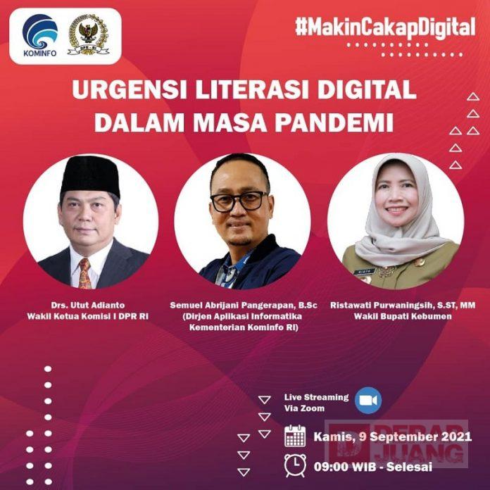Kabupaten Kebumen – Wakil Bupati Kebumen, Ristawati Purwaningsih menjadi narasumber kegiatan webinar bertajuk ‘Urgensi Literasi Digital dalam Masa Pandemi’ yang diselenggarakan Kementerian Kominfo bersama DPR RI, Kamis (9/9/2021).