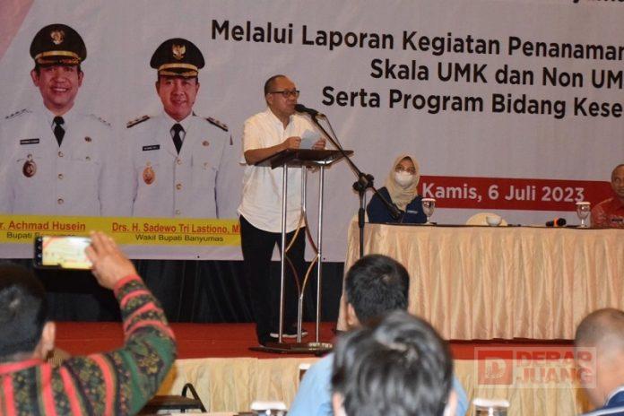 Kabupaten Banyumas – Wakil Bupati Banyumas, Drs. Sadewo Tri Lastiono menjadi narasumber dan memberikan dorongan kepada para pelaku usaha di Banyumas pada sosialiasi dan fasilitasi perizinan berusaha berbasis resiko yang dilaksanakan di Hall Aston Hotel Purwokerto, Kamis (6/7/2023).