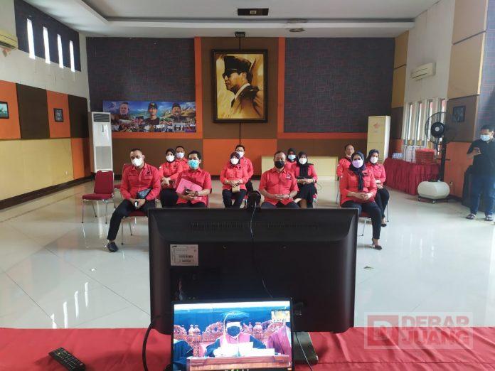 Kabupaten Boyolali – Pengurus DPC PDI Perjuangan Boyolali turut menyaksikan acara Pengukuhan Profesor Kehormatan kepada Ketua Umum Partai, Hj. Megawati Soekarnoputri secara virtual. Acara tersebut diikuti oleh Kader Banteng Boyolali dari ruang Balai Bung Karno Boyolali, Jumat (11/6/2021).