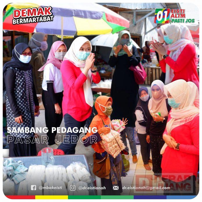Kabupaten Demak – Mengawali hari dengan semangat optimisme, Cabup Kab. Demak, dr. Hj. Eisti’anah atau yang akrab disapa Mbak Eisti menyambangi pedagang yang berada di Pasar Jebor untuk mensosialisasikan program-program yang berkaitan dengan kesejahteraan wong cilik, Minggu (29/11/2020).
