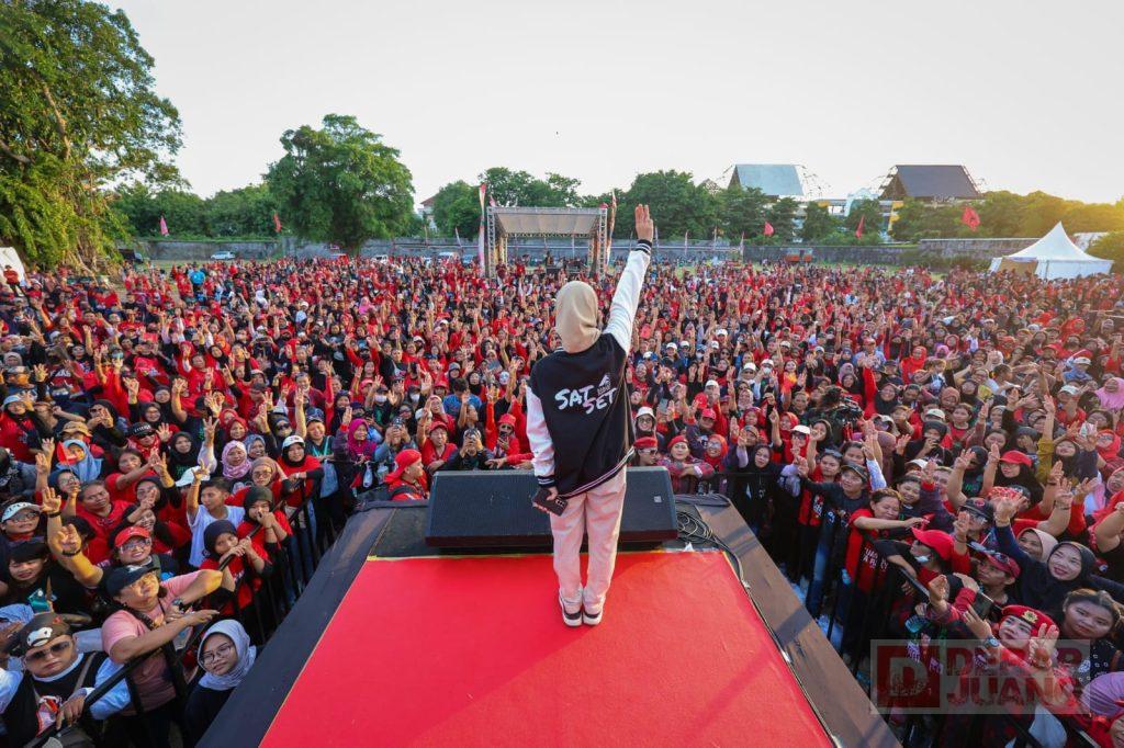 Belasan ribuan perempuan dari kader PDI Perjuangan dan kelompok relawan ‘tumpah ruah’ di Benteng Vastenburg. Tampak hadir Ketua DPC PDI Perjuangan Solo FX Hadi Rudyatmo. Siti Atiqoh hadir didampingi oleh Sekjen DPP PDI Perjuangan Hasto Kristiyanto yang juga Sekretaris TPN Ganjar-Mahfud.