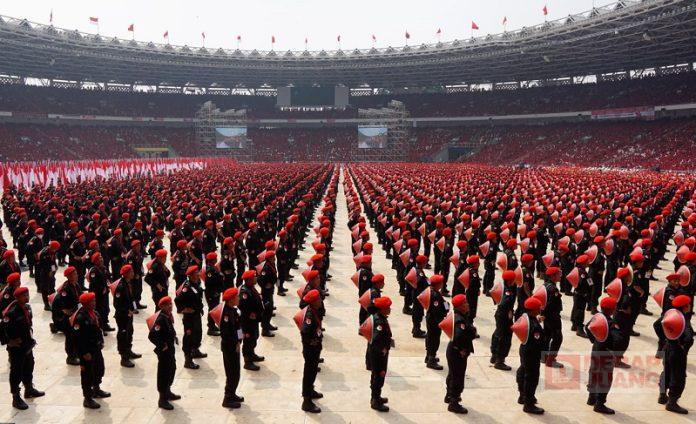 Jakarta – Ribuan personel Satgas Cakra Buana dari Jawa Tengah ikut serta menampilkan aksi baris-berbaris dan pembentukan formasi di acara Puncak Bulan Bung Karno bersama personel dari seluruh wilayah tanah air. Acara yang dilaksanakan di GBK ini bisa dibilang luar biasa, pasalnya dihadiri oleh 100.000 kader PDI Perjuangan .