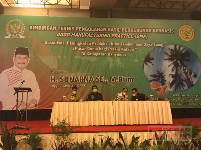 Kabupaten Banyumas – Anggota DPR RI Komisi IV Fraksi PDI Perjuangan, H. Sunarna, S.E,. M.Hum bersama dengan Kementerian Pertanian Republik Indonesia menggelar Bimbingan Teknis (Bimtek) Pengolahan Hasil Perkebunan Berbasis “Good Manufacturing Practice (GMP)” dan Sosialisasi Peningkatan Produksi, Nilai Tambah, dan Daya Saing di Pasar Dunia Bagi Petani Kelapa di Kab. Banyumas.