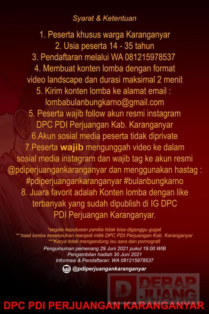 Kabupaten Karanganyar – Dalam rangka memperingati Bulan Bung Karno, DPC PDI Perjuangan Karanganyar menyelenggarakan Vlog Competition, Lomba Baca Teks Proklamasi. Lomba yang diselenggarakan dengan total hadiah Rp. 22.5 juta rupiah, tersebut dilaksanakan dengan gratis dan terbuka untuk umum, khusus masyarakat yang berada di Kab. Karanganyar.