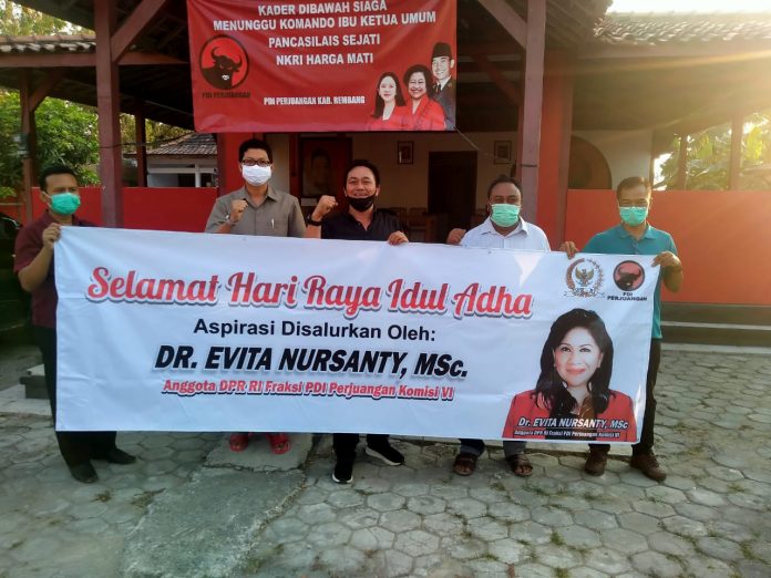 Kabupaten Rembang – Anggota DPR RI Komisi VI dari Fraksi PDI Perjuangan Dr. Hj. Evita Nursanty, S.H., M.Sc., berikan bantuan hewan kurban berupa satu ekor sapi dan delapan ekor kambing untuk DPC PDI Perjuangan Rembang, Selasa (28/7/2020).