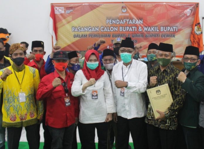 Kabupaten Demak – Ketua DPC PDI Perjuangan Kab.Demak, H. Sri Fahrudin Bisri Slamet mengawal langsung pendaftaran Pasangan Calon Bupati dan Calon Wakil Bupati Demak, yaitu dr. Hj. Eisti’anah dan Drs. H. Joko Sutanto (Eisti-Jos), untuk mendaftar sebagai Calon Bupati dan Wakil Bupati ke Kantor KPU Kab. Demak, Jumat (4/9/2020).