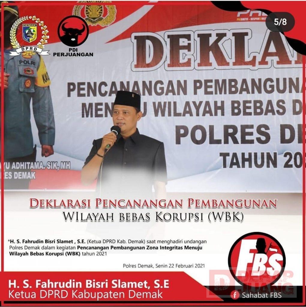Dalam sambutannya Politisi PDI Perjuangan itu menjelaskan, “saya mendukung penuh Polres Demak dalam Pencanangan Wilayah Bebas Korupsi (WBK) tahun 2021 ini,” jelasnya.