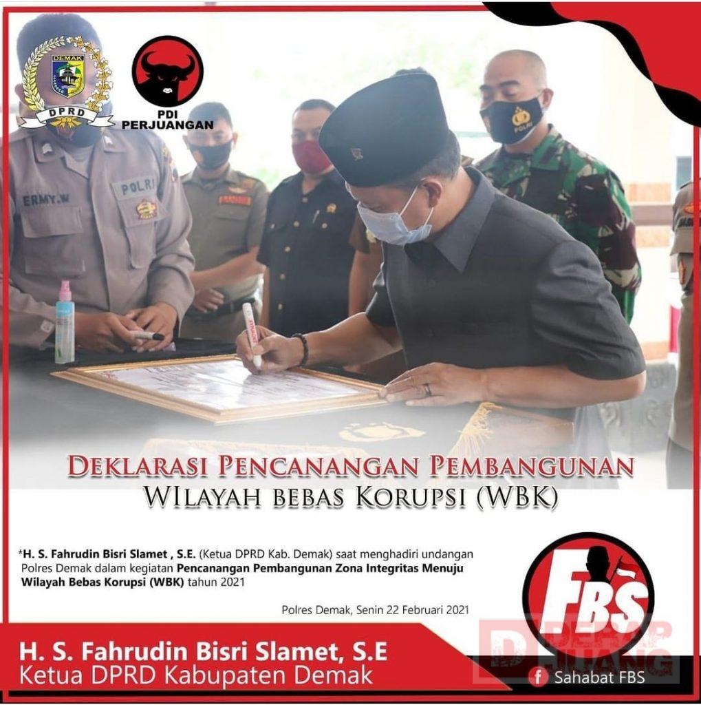Kabupaten Demak – Hadiri undangan Deklarasi Pencanangan Pembangunan Zona Integritas, Ketua DPRD Kab. Demak Fahrudin Bisri Slamet tegaskan akan selalu mendukung penuh dan berharap besar terhadap konsepsi ini, Senin (22/2/2021).