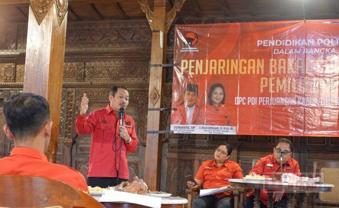 Kabupaten Temanggung – Jajaran struktural DPC PDI Perjuangan Temanggung bersama dengan KomandanTe Bintang Dua melakukan kegiatan rapat evaluasi pelaksanaan KomandanTe Stelsel di Pendopo Caruban, Kandangan. Adapun kegiatan ini juga dihadiri langsung oleh perwakilan dari DPD PDI Perjuangan Jawa Tengah, yakni Sofwan D Ardyanto selaku Wakil Ketua Bidang Rekrutmen dan Kaderisasi, Jumat (14/5/2022).