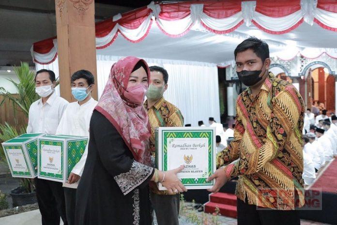 Sri Mulyani yang juga merupakan Ketua DPC PDI Perjuangan Kabupaten Klaten menyampaikan bahwa dalam kegiatan Sholat Isya’ dan Tarawih tersebut, Baznas Kabupaten Klaten menyalurkan bantuan sembako kepada petugas kebersihan dan THL di lingkungan Pemerintah Kabupaten Klaten. Adapun jumlah yang diberikan adalah sebanyak 144 paket dan ditujukkan bagi petugas kebersihan dan Tenaga Harian Lepas (THL).