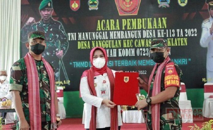 Kabupaten Klaten – Bupati Klaten, Hj. Sri Mulyani, S.M membuka program TNI Manunggal Membangun Desa (TMMD) Ke-113 wilayah Kodim 0723 Tahun Anggaran 2022 Klaten bersama Danrem 074 Warastratama dan Dandim 0723 Klaten di Desa Nanggulan, Kecamatan Cawas.