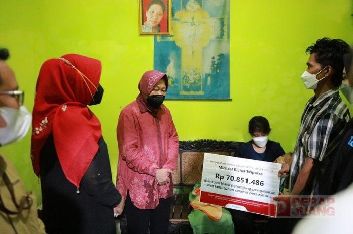 Tri Rismaharini pada kesempatan tersebut mengucapkan terima kasih kepada dermawan yang telah memberikan donasi melalui kitabisa.com dan dari Kemensos memberikan alat bantu kepada Richei berupa kursi untuk cerebral palsy.