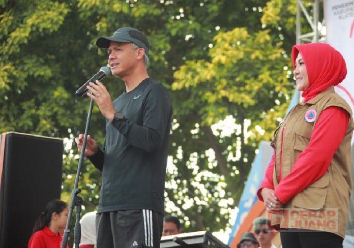 Kabupaten Klaten – Gubernur Jawa Tengah, Ganjar Pranowo bersama Bupati Klaten, Hj. Sri Mulyani ikuti jalan sehat bersama warga, mengintari jalan perkotaan di Klaten, Jumat (1/9/2023).