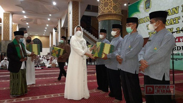 Dalam kesempatan tersebut, Sri Mulyani yang juga Ketua DPC PDI Perjuangan Kabupaten menyerahkan 44 paket sembako dari Bank Klaten kepada THL Masjid Agung Al Aqsa.