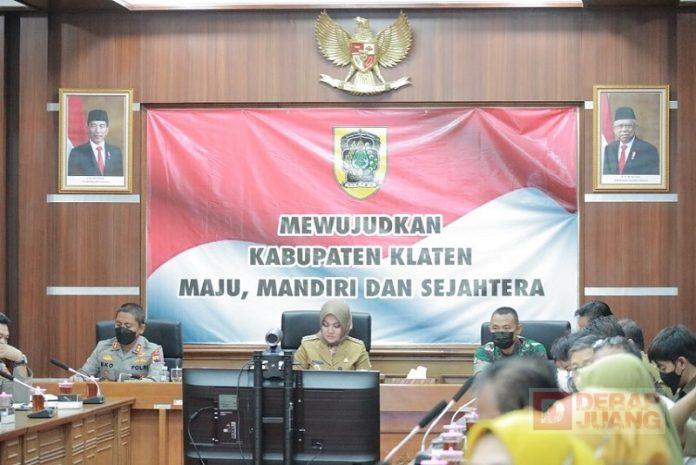 Kabupaten Klaten – Bupati Klaten, Hj. Sri Mulyani, S.M mengikuti Rapat Koordinasi Pengendalian Inflasi Daerah yang diselenggarakan di Ruang Rapat Utama Gedung B, Setda Kabupaten Klaten, Senin (5/9/2022).