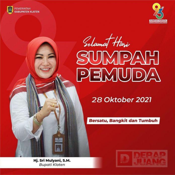 Kabupaten Klaten – Pemuda yang memiliki karakter yang tangguh adalah pemuda yang memiliki karakter moral dan karakter kinerja, pemuda yang beriman dan bertaqwa, berintegritas tinggi, jujur, santun, bertanggung jawab, disiplin, kerja keras, kerja cerdas, kerja ikhlas, dan tuntas. Hal tersebut disampaikan Bupati Klaten Hj.Sri Mulyani, S.M., di Kantor Pemkab Klaten, Kamis (28/10/2021).