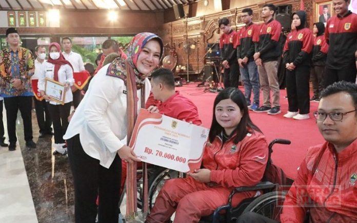 Kabupaten Klaten – Bupati Klaten, Hj. Sri Mulyani, S.M bersama jajaran Pemkab Klaten melalui Dinas Kebudayaan Kepemudaan Olahraga dan Pariwisata Klaten menyerahkan penghargaan olahraga kepada para atlet dan pelatih di Pendopo Pemerintah Kabupaten Klaten, Rabu (28/12/2022).
