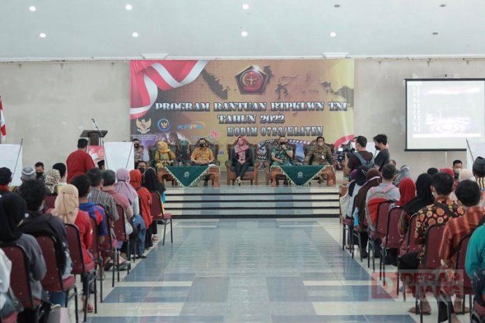Kabupaten Klaten –Bupati Klaten, Hj. Sri Mulyani meninjau langsung kegiatan penyaluran Bantuan Tunai Pedagang Kaki Lima, Warung, dan Nelayan (BTPKLWN) yang dilaksanakan Kodim 0723 Klaten, Jumat (8/4/2022).
