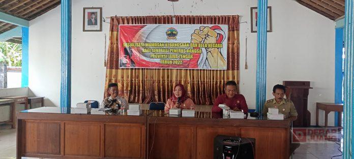 Kabupaten Banjarnegara – Generasi penerus bangsa harus dapat berperan serta dalam merawat NKRI. Hal tersebut disampaikan oleh Hj. Sri Ruwiyati, S.E., M.M., Anggota Fraksi PDI Perjuangan DPRD Provinsi Jawa Tengah pada sosialisasi wawasan kebangsaan dan bela negara bagi generasi penerus bangsa bersama Dinas Kepemudaan, Olahraga dan Pariwisata Provinsi (Disporapar) Jawa Tengah. Kegiatan tersebut dilaksanakan di Balai Desa Merden, Kecamatan Purwanegara, Senin (25/7/2022).