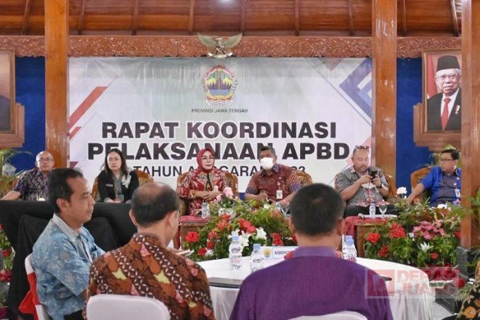 Kabupaten Grobogan – Bupati Grobogan, Sri Sumarni membuka pelaksanaan Rapat Koordinasi (Rakor) Keuangan Daerah se-Eks Bakorwil Satu, yang bertempat di Pendopo Kab. Grobogan, Selasa (21/02/2023).