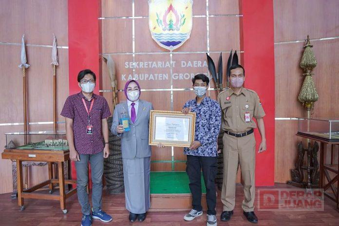 Kabupaten Grobogan – Apresiasi diberikan Bupati Grobogan, Sri Sumarni kepada Hidayatulah Ahmad, salah satu pemuda asli Grobogan yang berhasil meraih juara nasional Apresiasi Video Literasi Masyarakat Tahun 2021, Selasa (05/10/2021).