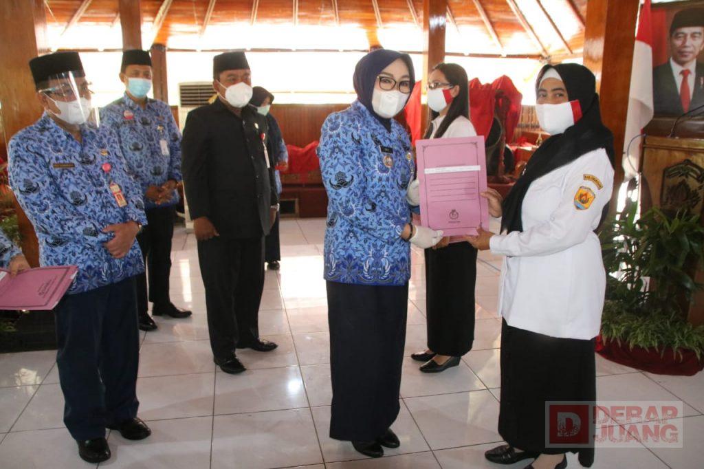 Kabupaten Grobogan – Hj. Sri Sumarni selaku Bupati ditemani H. Musafak selaku Ketua Komisi A DPRD, Sekda, dan Kepala OPD Kab. Grobogan menyerahkan Surat Keputusan Pengangkatan Pegawai Pemerintah dengan Perjanjian Kerja (PPPK) di lingkungan Pemerintah Kab. Grobogan Formasi tahun 2020, Rabu (17/2/2021).