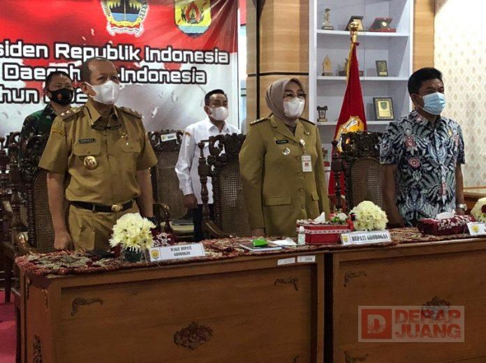 Terlihat dalam rapat yang diadakan secara virtual tersebut Sri Sumarni ditemani Bambang Pujiyanto selaku Wakil Bupati Grobogan, Forkompimda serta OPD yang dilangsungkan Ruang Rapat Wakil Bupati, Rabu (28/4/2021).