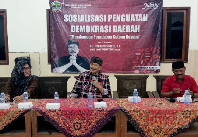Kabupaten Klaten – Anggota Fraksi PDI Perjuangan DPRD Jawa Tengah, Drs. Stephanus Sukirno, M.S menggelar Sosialisasi Penguatan Demokrasi Daerah di gedung pertemuan Dukuh Jiwo Kulon, Desa Trotok, Kecamatan Wedi, Jumat (9/6/2023).