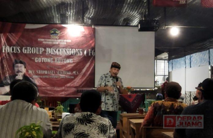 Kabupaten Klaten – Anggota Fraksi PDI Perjuangan DPRD Jawa Tengah, Drs. Stephanus Sukirno, M.S menggelar Focus Group Discusions (FGD) di Raja Bakaran Klaten, Jalan Mpu Sedah Desa Nglinggi, Kecamatan Klaten Selatan, Minggu (18/6/2023). Kegiatan FGD yang mengusung tema ‘Gotong Royong’ ini dihadiri sejumlah camat, kepala desa, dan lurah di Daerah Pemilihan (Dapil) I Klaten.