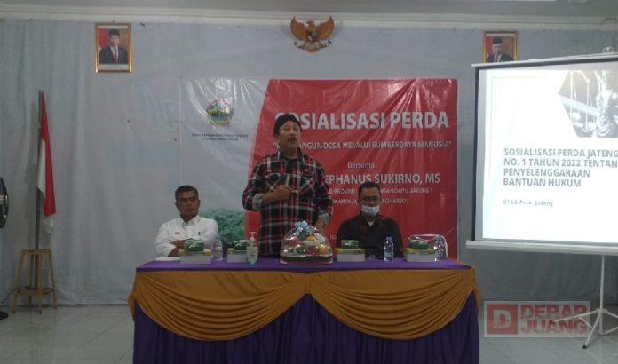 Kabupaten Klaten – Anggota Fraksi PDI Perjuangan DPRD Jawa Tengah, Drs. Stephanus Sukirno, M.S menggelar sosialisasi Peraturan Daerah (Perda) Jawa Tengah Nomor 1 Tahun 2022 tentang Penyelenggaraan Bantuan Hukum di Gedung Desa Joggrangan, Kecamatan Klaten Utara, Sabtu (19/11/2022).
