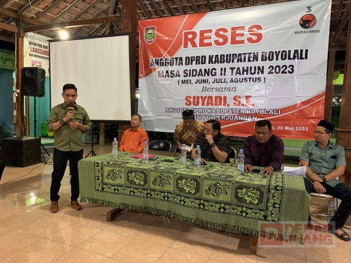 Kabupaten Boyolali – Anggota Fraksi PDI Perjuangan DPRD Boyolali, Suyadi, S.E kembali turun ke Dapil dalam rangka Reses untuk menyerap aspirasi konstituennya di Desa Glintang, Sabtu (20/5/2023).