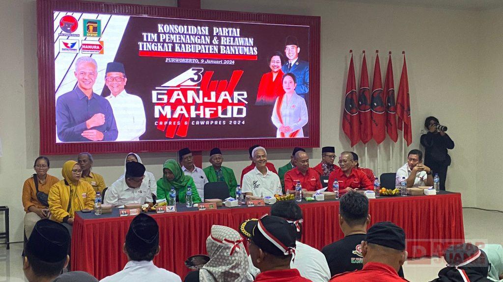 Kabupaten Banyumas – Calon Presiden (Capres) nomor urut 3, Ganjar Pranowo menghadiri pertemuan dengan Tim Pemenangan Cabang (TPC) Ganjar-Mahfud Kabupaten Banyumas, Struktural Partai, KomandanTe Bintang Dua, Tiga dan Empat Banyumas, calon anggota legislatif partai koalisi, dan para relawan di Kantor DPC PDI Perjuangan Banyumas, Selasa (9/1/2024).