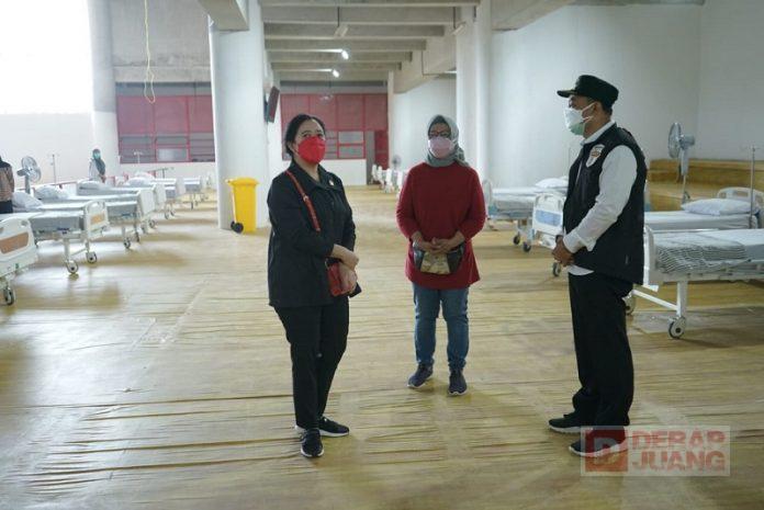 Kota Surabaya – Ketua DPR RI, Puan Maharani meninjau kesiapan Rumah Sakit Darurat Lapangan Tembak Kedung Cowek, Surabaya yang dipersiapkan untuk merawat pasien terpapar virus Covid-19. Puan datang untuk menjalankan fungsi pengawasan DPR RI terkait penanganan pandemi Covid-19 di Indonesia.
