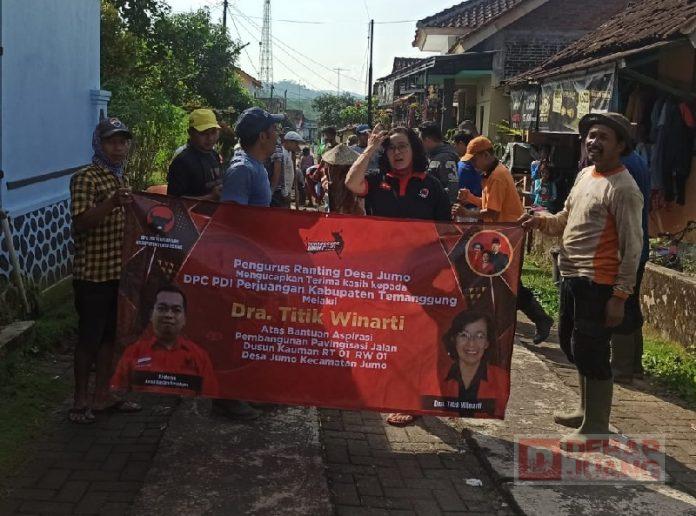 Kabupaten Temanggung – KomandanTe Bintang Dua Dapil 4 Temanggung, Titik Winarti memperingati Bulan Bung Karno dengan menggelar kegiatan kerja bakti bersama masyarakat Dusun Kauman, Desa Jumo. Kerja bakti berupa pavingisasi ini adalah langkah yang diorientasikan untuk meningkatkan aksesibilitas keluar masuk dusun, Minggu (12/6/2022).