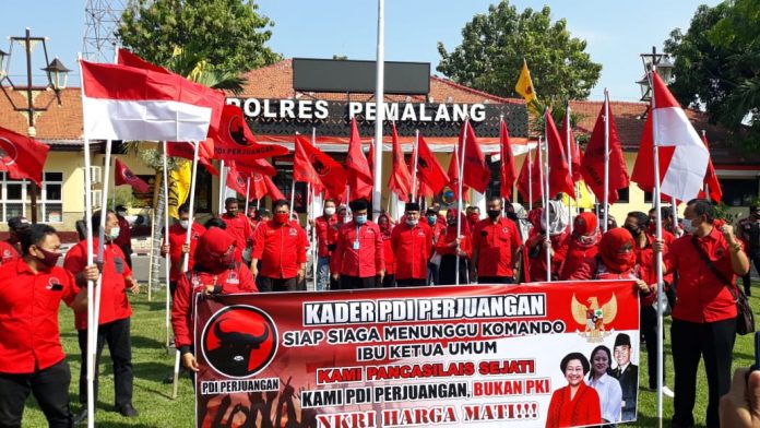 Kabupaten Pemalang – Ketua DPC PDI Perjuangan Kabupaten Pemalang, Dr. H. Junaedi, S.H., M.M didampingi Sekretaris DPC PDI Perjuangan Kabupaten Pemalang, H.M Agus Sukoco, S.IP., M.Si, beserta puluhan Kader PDI Perjuangan Kabupaten Pemalang mendatangi Polres Pemalang dengan tujuan untuk menuntut terkait pengusutan kasus pembakaran bendera PDI Perjuangan oleh demonstran di depan Gedung DPR RI. Aksi yang dilakukan oleh Kader PDI Perjuangan Kabupaten Pemalang tersebut diterima Wakapolres Pemalang, Kompol Ari Prasetyo, Sabtu (27/6/2020).