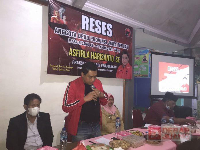 Kabupaten Banyumas – Anggota Fraksi PDI Perjuangan DPRD Provinsi Jawa Tengah, Asfirla Harisanto, S.E., turun ke Dapil untuk menjaring aspirasi masyarakat di Desa Jingkang, Kecamatan Ajibarang. Dihadiri oleh Kepala Desa Jingkang, serta Jajaran PAC PDI Perjuangan Kecamatan Ajibarang, kegiatan dilaksanakan dengan menerapkan protokol kesehatan yang ketat, Jumat (25/2/2022).