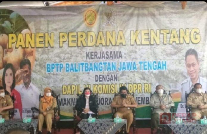 Kabupaten Magelang – Anggota Komisi IV DPR RI, Vita Ervina mengaku takjub dengan hasil pertanian warga Dusun Nampan, Desa Sukomakmur, Kecamatan Kajoran Kabupaten Magelang. Ia melihat lahan pertanian warga di Lereng Gunung Sumbing ini sangat subur. Adapun komoditas yang dikembangkan mayoritas petani adalah kentang dan loncang.