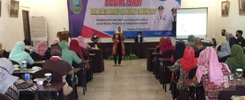 Kabupaten Kebumen – Wakil Bupati Kebumen Ristawati Purwaningsih membuka sekaligus menjadi narasumber Sosialisasi Hak Asasi Manusia (HAM) tahun 2021 dengan tema Penghormatan Hak-hak Penyandang Disabilitas dalam Bidang Pekerjaan di Kabupaten Kebumen. Giat ini diselenggarakan di Ballroom Hotel Mexolie. Rabu, (13/10/2021).